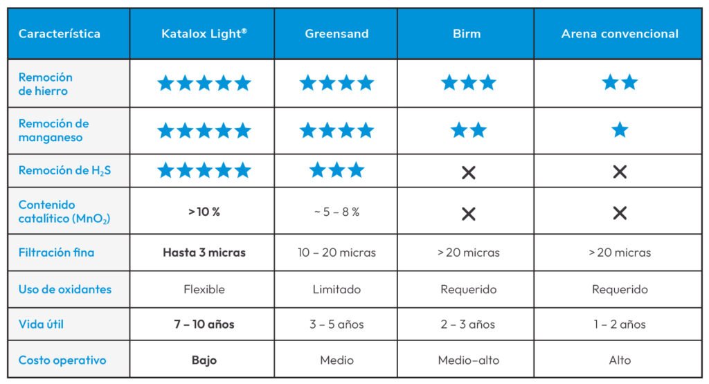 Gracias a su alto contenido de dióxido de manganeso (MnO₂ >10 %) y a su base de zeolita, combina oxidación catalítica + filtración fina en un solo medio, logrando resultados superiores frente a medios tradicionales.
